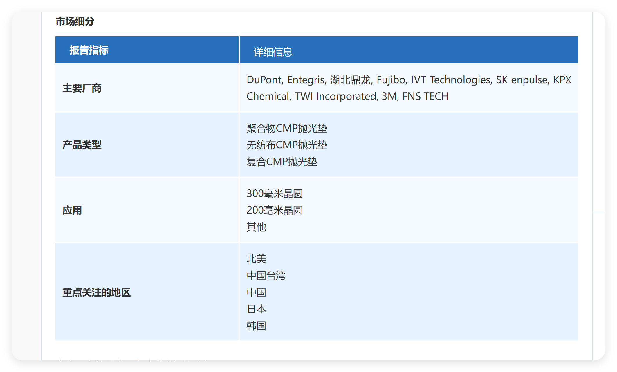 2019年,全球CMP抛光垫市场规模达到了774。09百万美元,估计2026年将达到1071。19百万美元,2020-2026年复合增加率(CAGR)为5。1%。目前,考虑到成本,以及硅片的大小对集成电机能和效率的影响,晶圆的尺寸增大化曾经是一种必然趋向,也是一种支流趋向。特别8英寸,12英寸的产物,将来可能向着18英寸的标的目的成长。可是尺寸越大,出产相对应的CMP垫的难度也正在增大。当下逛尺寸增大化成为一种必然的趋向时,为了占领市场,那就需要可以或许研发大尺寸的抛光垫,不然被市场裁减。跟着对集成电的优胜机能提拔的等候,CMP垫的抛光机能要有所添加,所以,将来对其的利用机能必然会要求的愈加严酷。当场区来说,中国是最大的消费市场,2015年市场拥有率为22。08%,有所下降。韩国排列第二位,2015年市场份额为20。85%,2019年市场拥有率为21。15%。全球市场,CMP抛光垫次要出产商包罗DuPont、Cabot、FOJIBO等。中国市场,CMP抛光垫次要出产商包罗湖北鼎龙,江丰电子和姑苏不雅胜半导体。目前,全球的次要企业次要集中正在美国,日本以及中国。虽然国内有些企业正在做,可是相对于国际企业,市场规模相对较小。中国目前的市场化的几家企业都没有取得国外的认证,所以临时没有出口。因为下逛企业次要集中正在日本,,韩国,欧美等国度,同时这些国度除了欧洲和韩国以外,其他几个地域的CMP抛光垫的本土企业市场地位较大,电子行业次要集中正在亚太地域,可是因为目前的形势不太乐不雅,特别是2020年,可能是中国正在近30年里的危机最严沉的一年。中国将来几年可能会削减进口量,更多的以本土企业为次要供应商,当然,这些企业也很难出口。加前次要的消费地域曾经有全球领先的企业,欧洲可能是中国最先打破僵局的区域。所以将来的几年,国内的企业产物次要以内销为从。同时,因为目前的商业摩擦以及中国目前的国际要素,目前对国内的CMP抛光垫来说,可能是占领市场的最好机会,国度的政策投入将来几年也会日益添加。所以,将来几年将中国企业送来国产化机缘。我们预测,湖北鼎龙控股股份无限公司为了占领市场,可能会自动的调低产物的价钱,疯狂的占领市场。对于曾经进入的出产商来说,需要不竭的提拔手艺门槛,更多企业进入;通过降低成本从而降低价钱的策略,快速占领市场,开辟增量客户市场,成立起市场拥有率劣势;打制品牌抽象,为进入消费品市场奠基劣势,只要如许,才能正在激烈的合作中具有拥有更大市场份额的本钱。前往搜狐,查看更多。